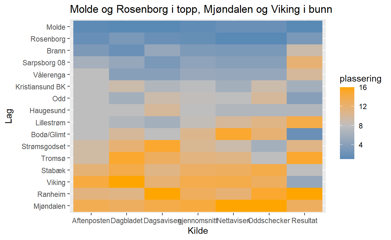 Da var Eliteserien over for i år. Hvordan gikk det med [tippinga](https://suppe-og-analyse.netlify.com/post/eliteserien-2019-hvordan-blir-tabellen-til-slutt/) fra mars? Da bestemte jeg for å legge gjennomsnittet av oddssidenes tipping og avisenes ekspertkommentarer til grunn..