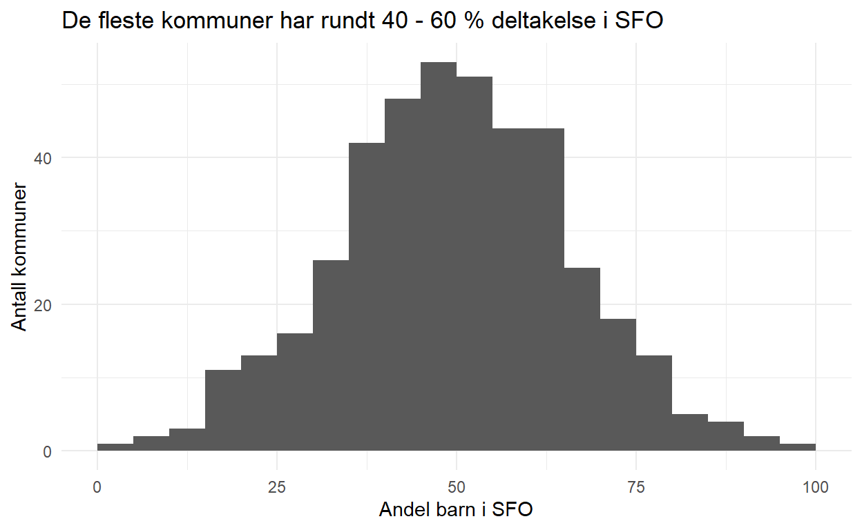 Hvordan visualisere fordelinger på tvers av kategorier, med eksempler fra deltakelse i skolefritidsordninga i norske kommuner