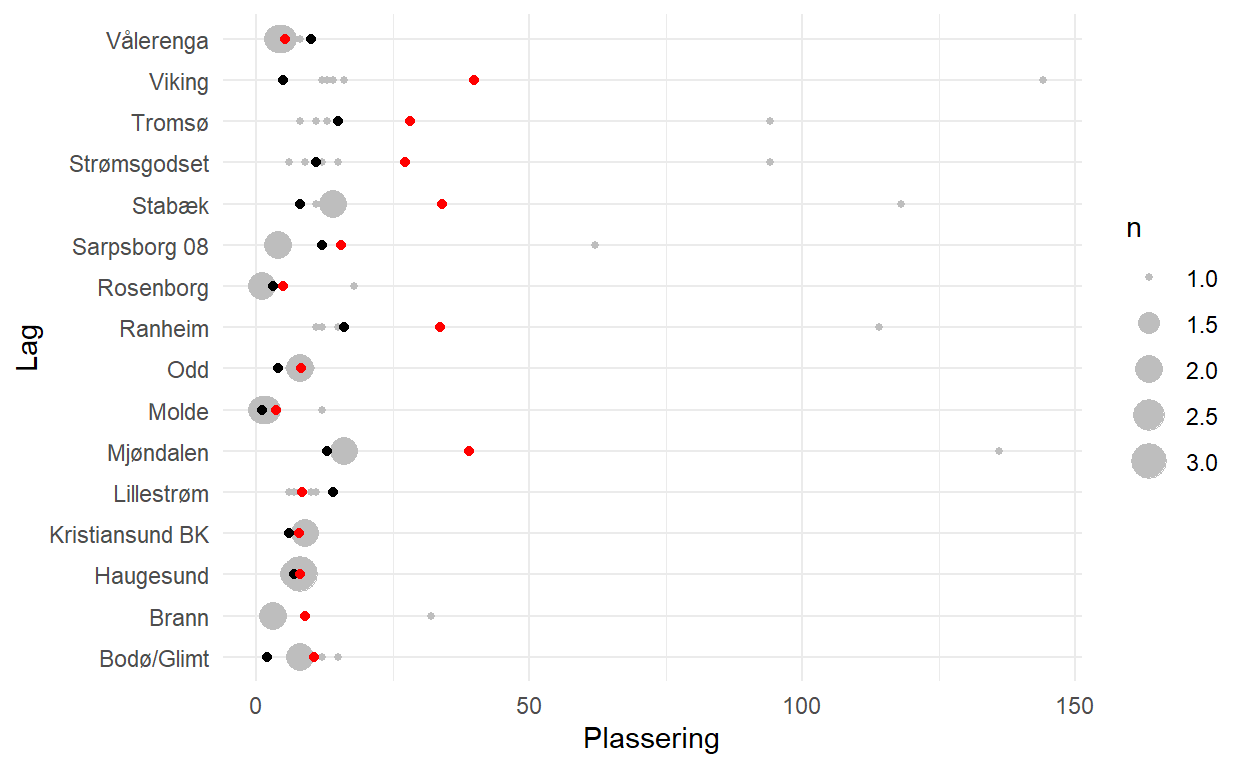 Noen enkle eksplorerende analyser av ekspertmeninger for en konkurranse om å gjette plasseringer i eliteserien 2019.