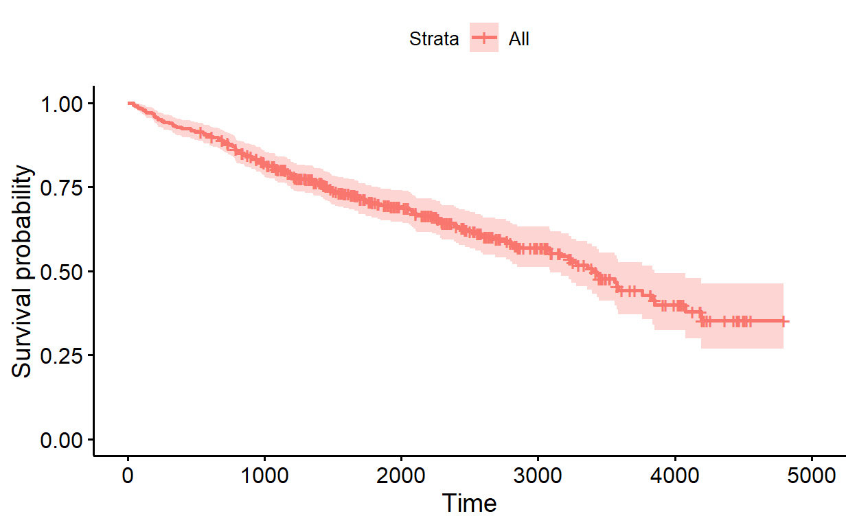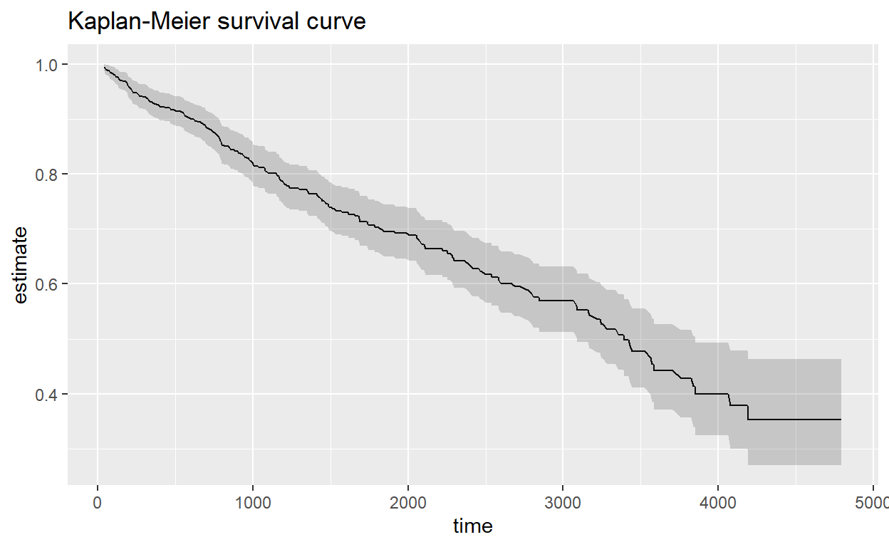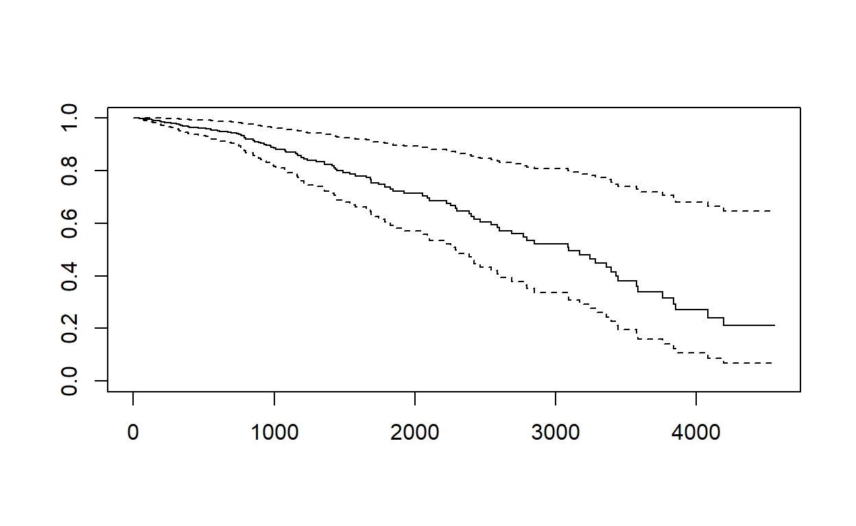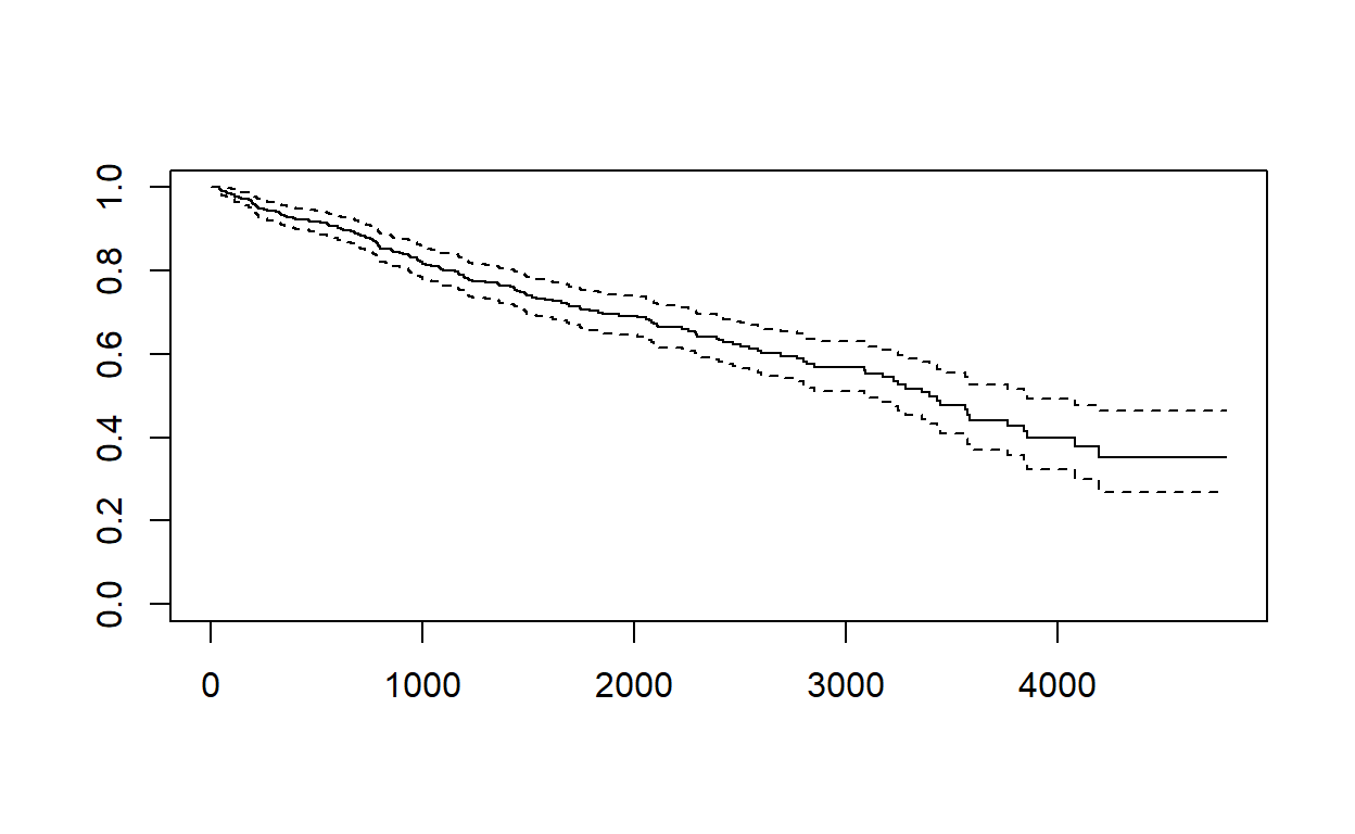 Her får vi ut n, antall positive statuser (død - så språket mister litt mening her etter hvert, når modelleringsspråk kolliderer med vanlige betydninger), median tid-til-event (3 395 dager til død), og 95 % konfidensintervaller rundt medianen. Vi kan plotte funksjonen med base plot.