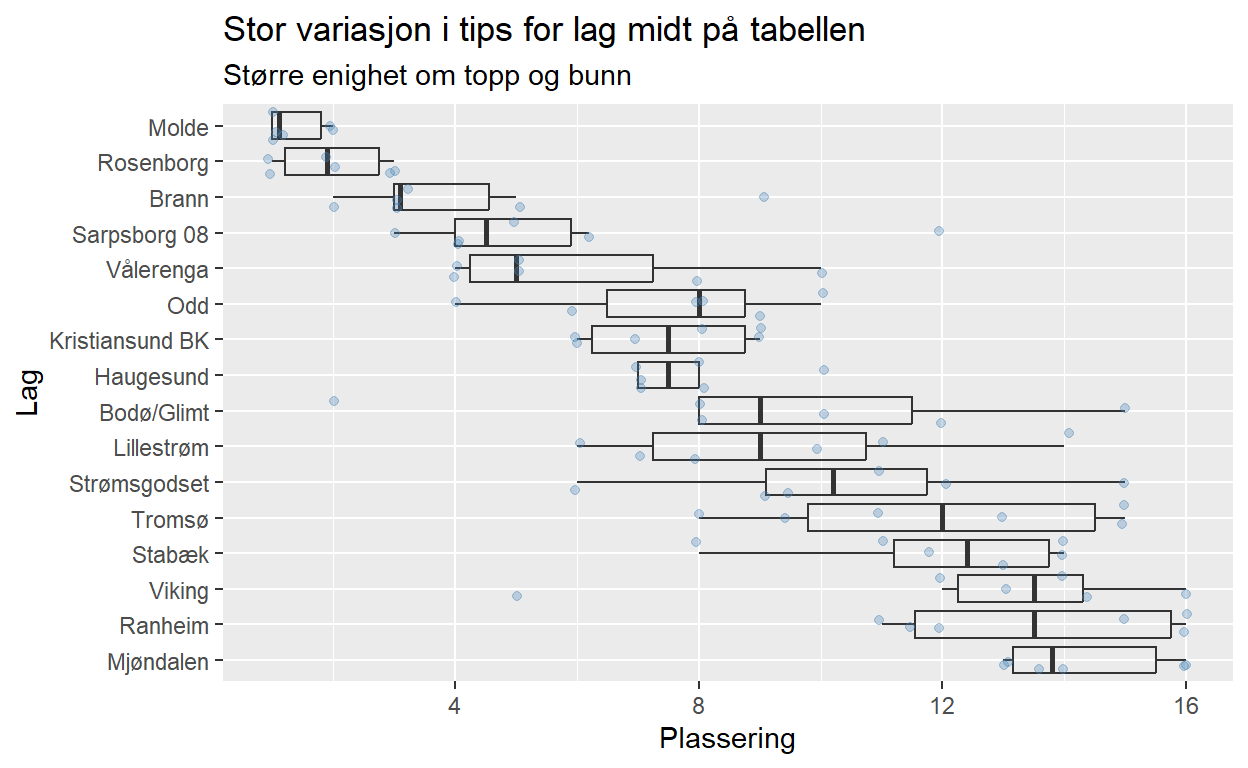 labs(x = "Lag", y = "Plassering", title = "Stor variasjon i tips for lag midt på tabellen", subtitle = "Større enighet om topp og bunn") +