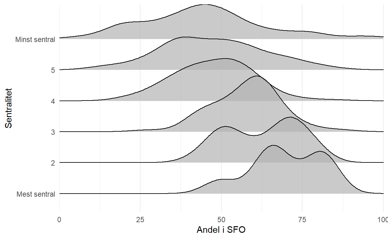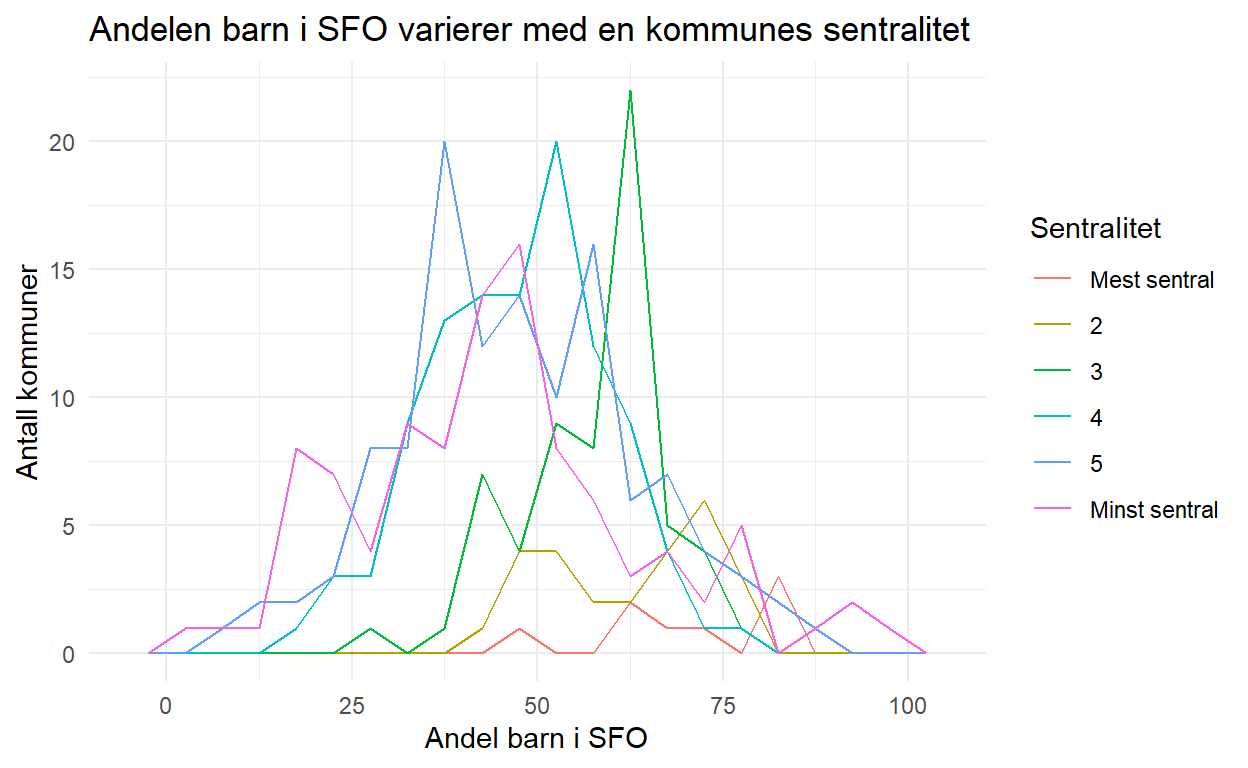 labs(y = "Antall kommuner", x = "Andel barn i SFO", colour = "Sentralitet", title = "Andelen barn i SFO varierer med en kommunes sentralitet")