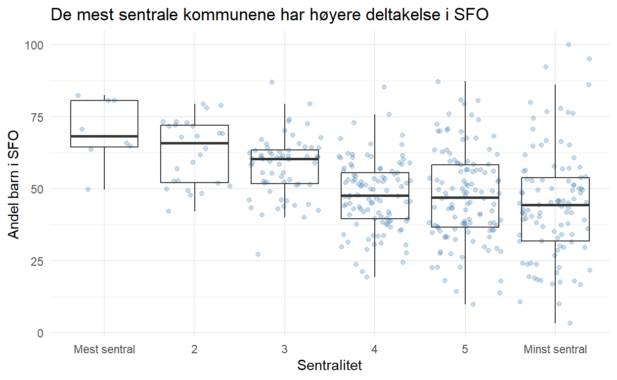 labs(x = "Sentralitet", y = "Andel barn i SFO", title = "De mest sentrale kommunene har høyere deltakelse i SFO")