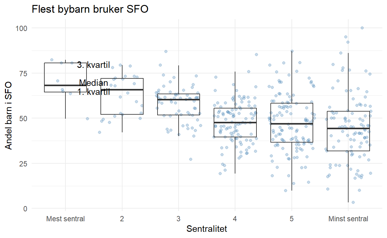 Denne visualiseringa får også helt tydelig fram at vel er det slik at de mer sentrale kommunene har høyere SFO-deltakelse, men spredninga er også langt større blant de mindre sentrale kommunene.