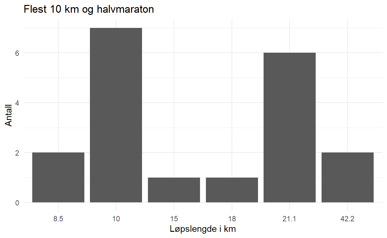 labs(title = "Flest 10 km og halvmaraton", x = "Løpslengde i km", y = "Antall")