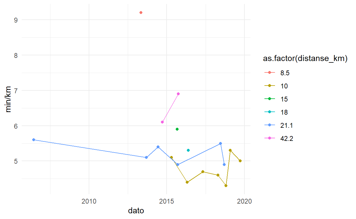 geom_line(aes(x = dato, y = `min/km`, colour = as.factor(distanse_km)))