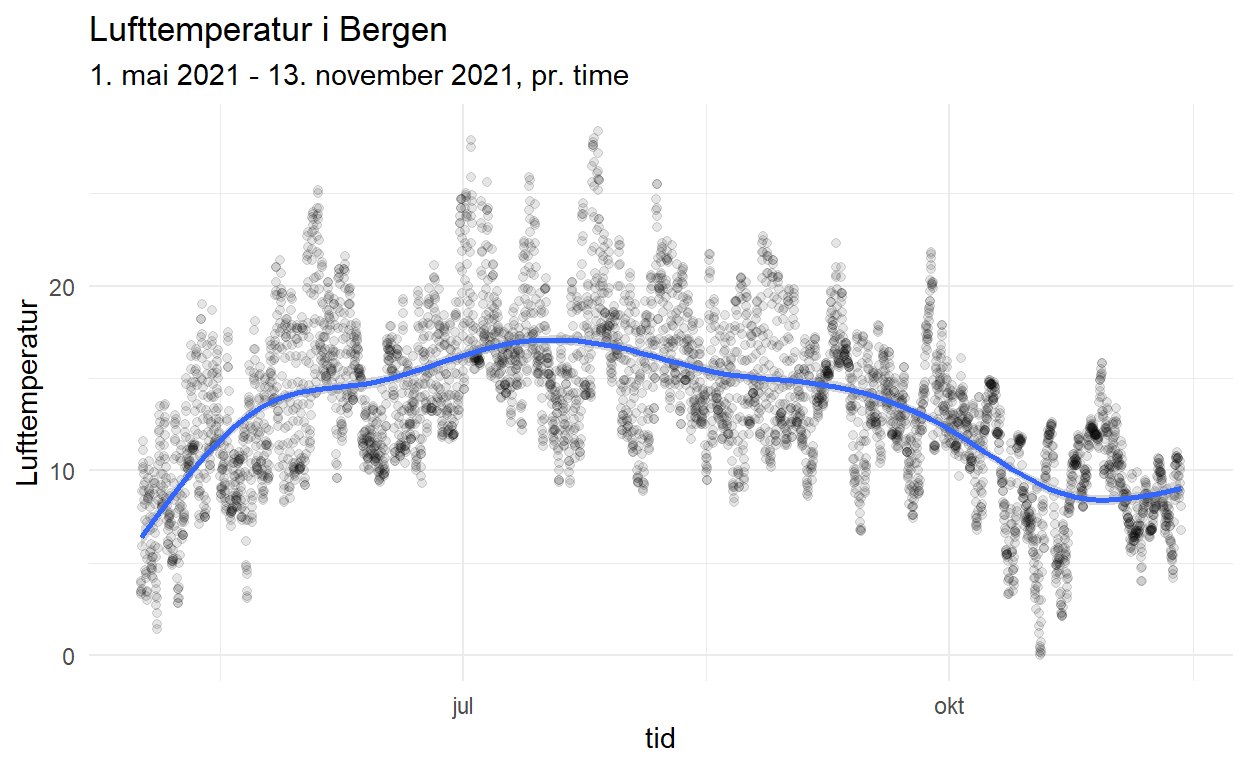 labs(title = "Lufttemperatur i Bergen", subtitle = "1. mai 2021 - 13. november 2021, pr. time")