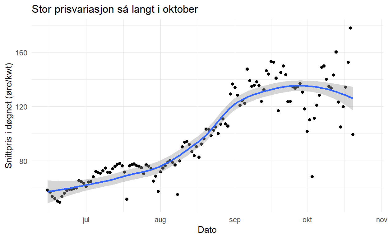 Med en lineær regresjon finner vi en sammenheng mellom pris og forbruk - men temmelig svak: for hvert øre prisen øker, går forbruket opp med 7 watt. Det er ikke mye. Som vi så av figuren over, har gjennomsnittlig døgnpris gått opp fra rundt 100 ør pr. kwt til 140 øre pr kwt fra starten av september til starten av oktober. 40 øres økning samsvarer da med en økning i forbruket på 280 watt pr. time (0,3 kwt).