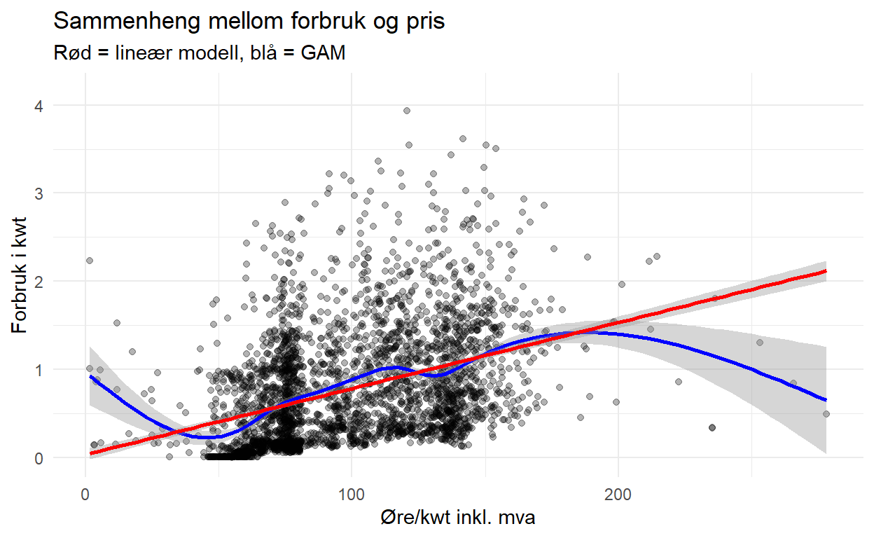 Bruker jeg mindre strøm når prisen er høy? Svaret ser ut til å være nei - enten så bruker jeg mer ved høyere pris, eller i hvert fall det samme (men mer fordi været er kaldere).