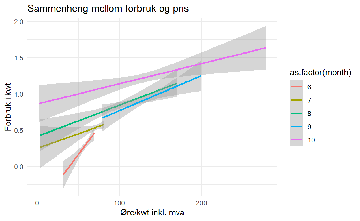 Hvis jeg lager separate lineære regresjonslinjer for de ulike månedene (med en tanke om at værforholdene er nokenlunde like innenfor hver måned), får jeg mye det samme bildet: høyere forbruk henger sammen med høyere priser.