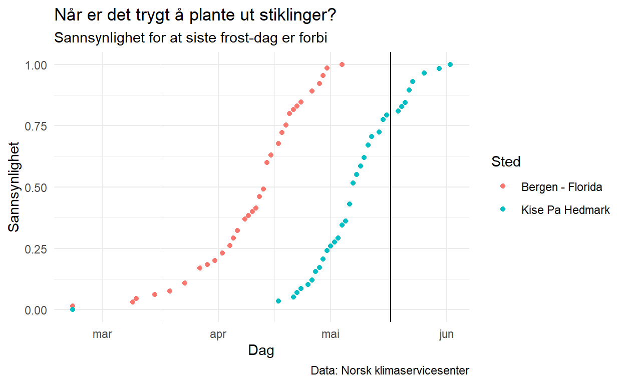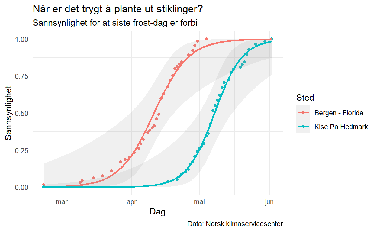 labs(title = "Når er det trygt å plante ut stiklinger?", subtitle = "Sannsynlighet for at siste frost-dag er forbi", colour = "Sted", x = "Dag", y = "Sannsynlighet", caption = "Data: Norsk klimaservicesenter")